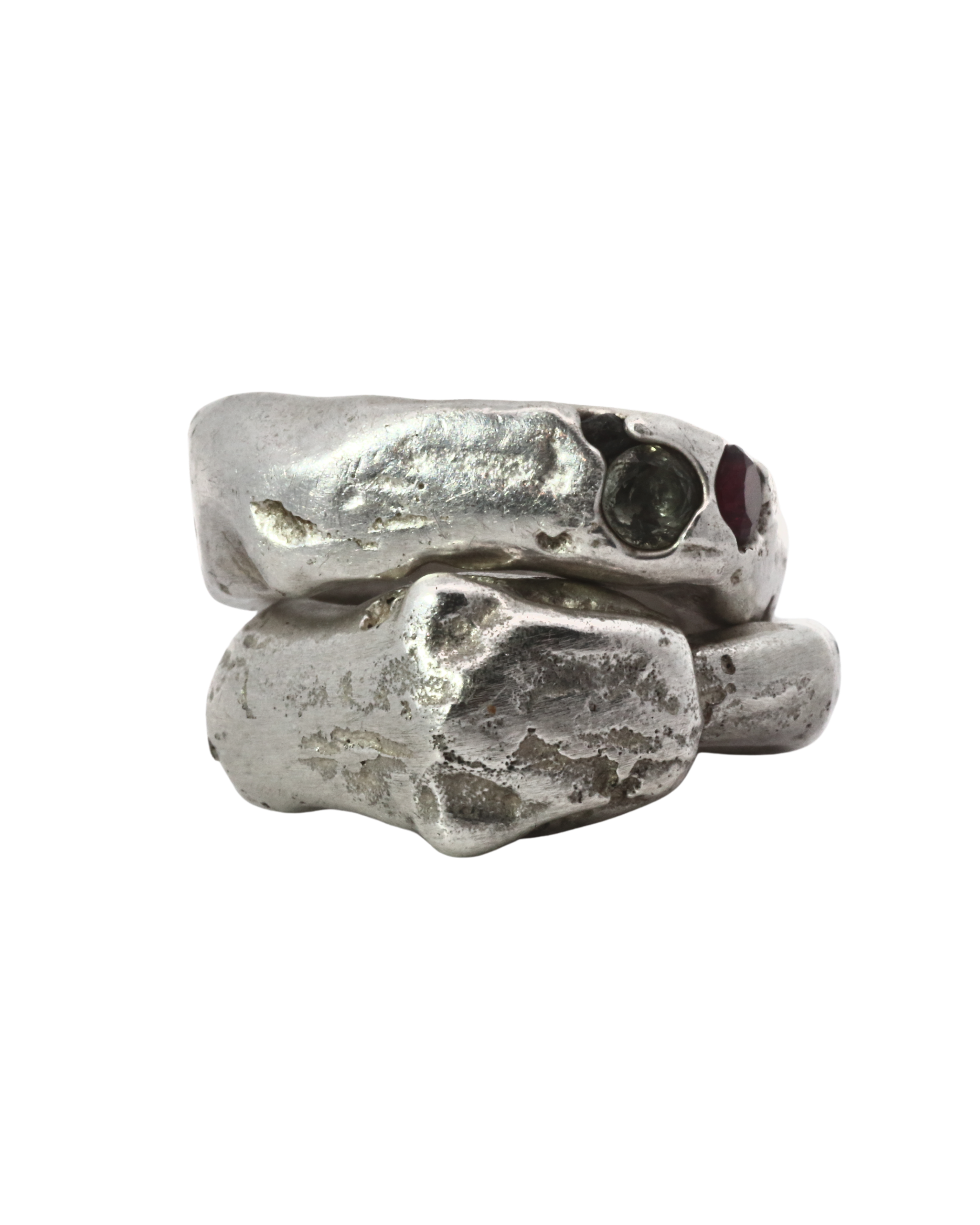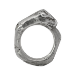 This collection of sand cast statement rings embraces the weight of metal and is solid sterling silver weighing approximately 17 grams.  These rings are weighty and playful wearable sculptures, raw and unrefined, yet polished enough to evoke the coveted patina of time.