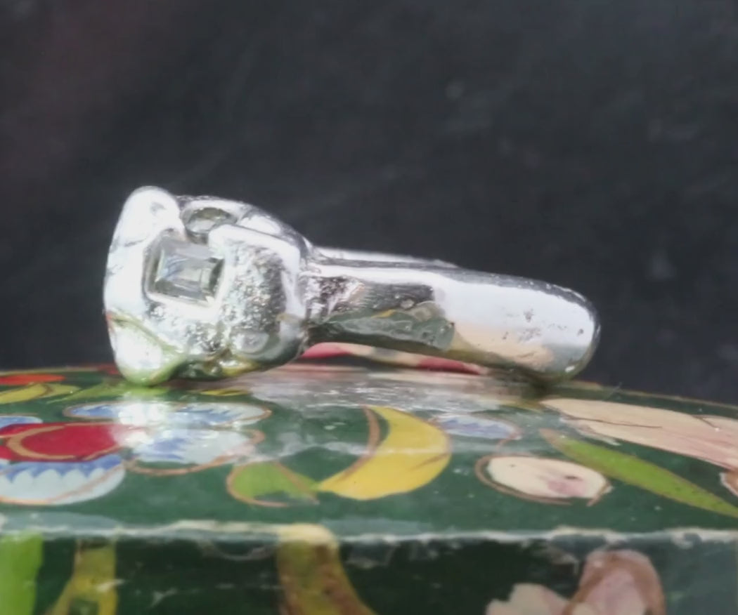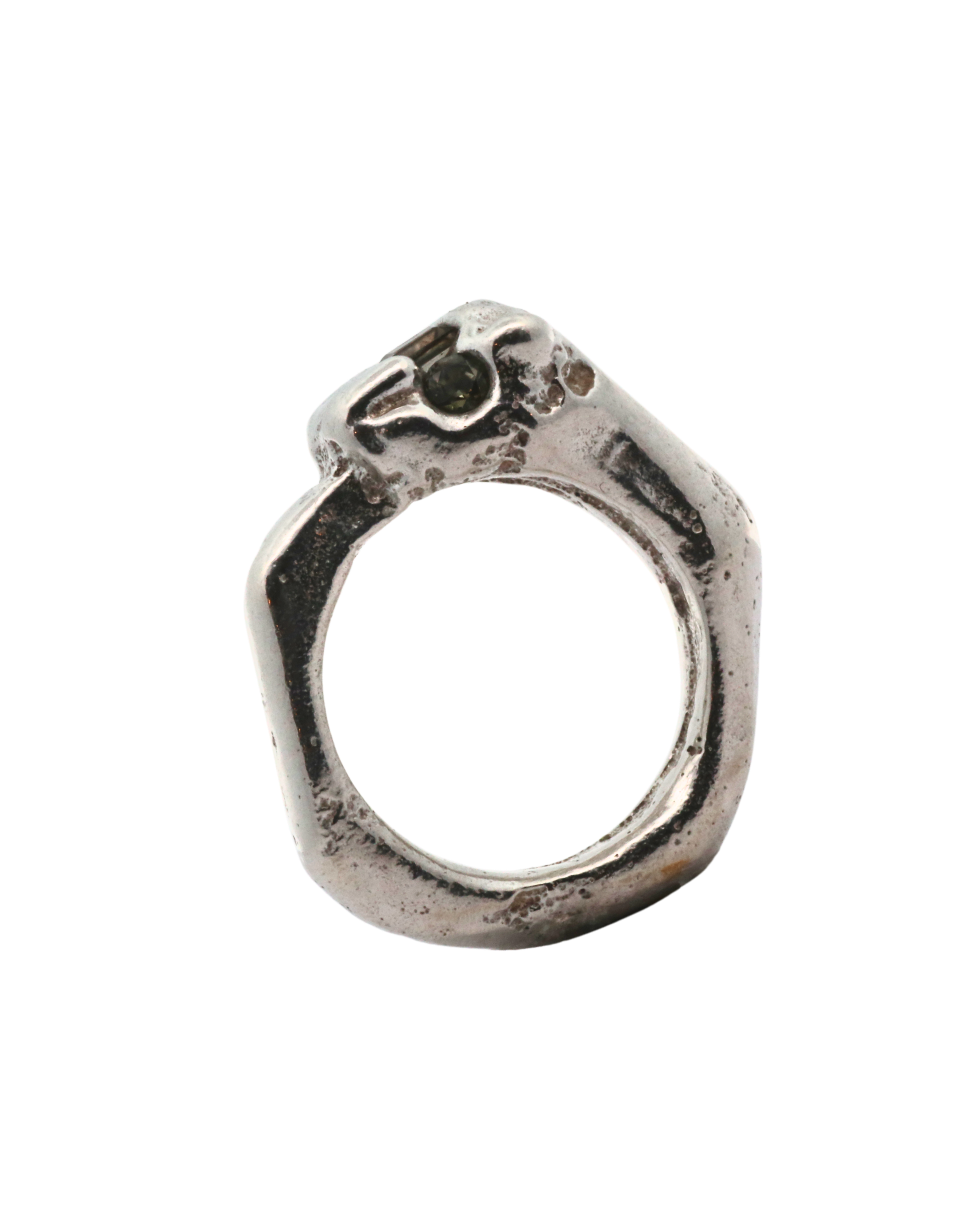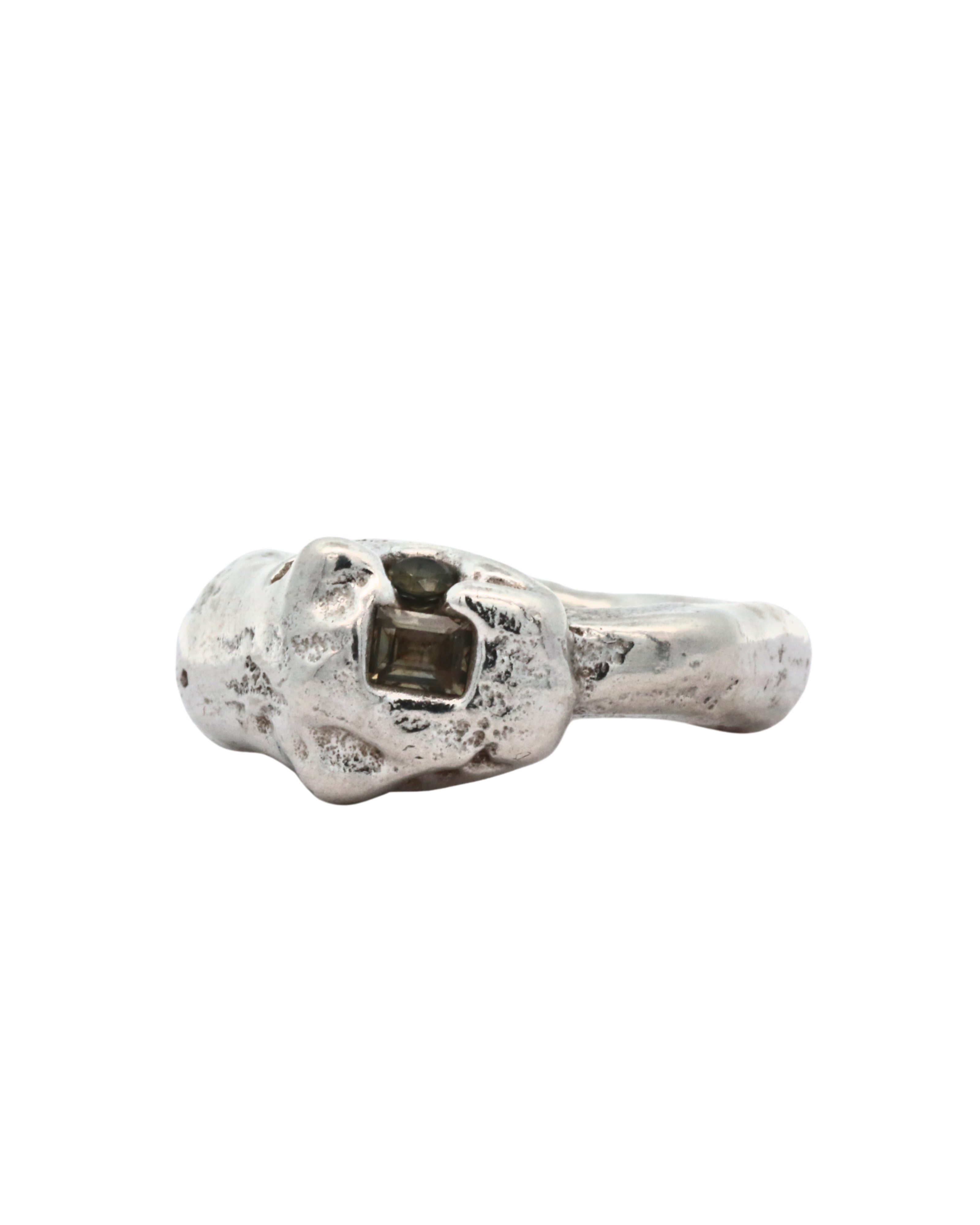 Big statement ring hand carved and in wax and sand cast in recycled sterling silver with Pale green sapphire baguette embedded at the crown nestled next to a cornflower blue sapphire eye.
