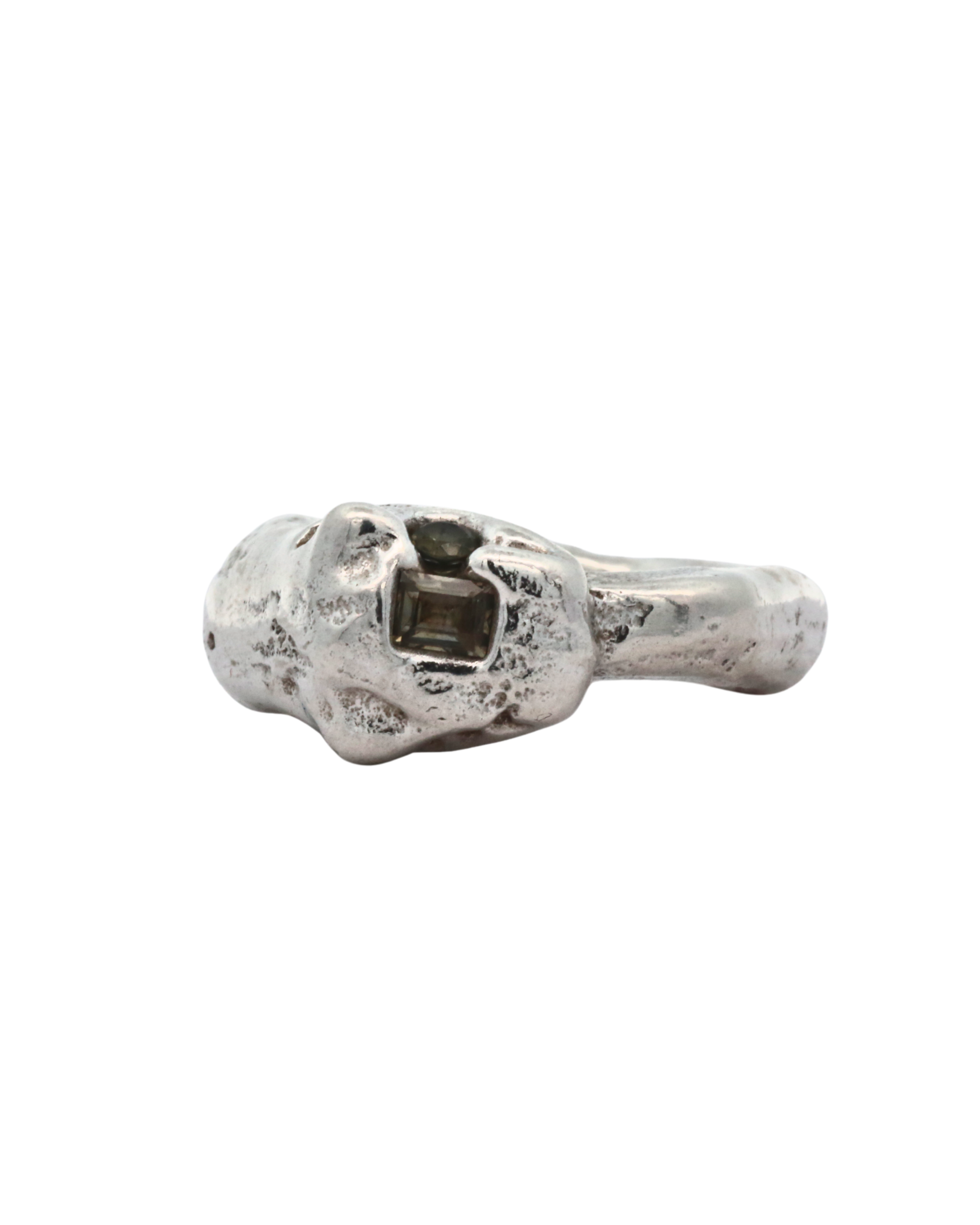 This collection of sand cast statement rings embraces the weight of metal and is solid sterling silver weighing approximately 17 grams. These rings are weighty and playful wearable sculptures, raw and unrefined, yet polished enough to evoke the coveted patina of time.