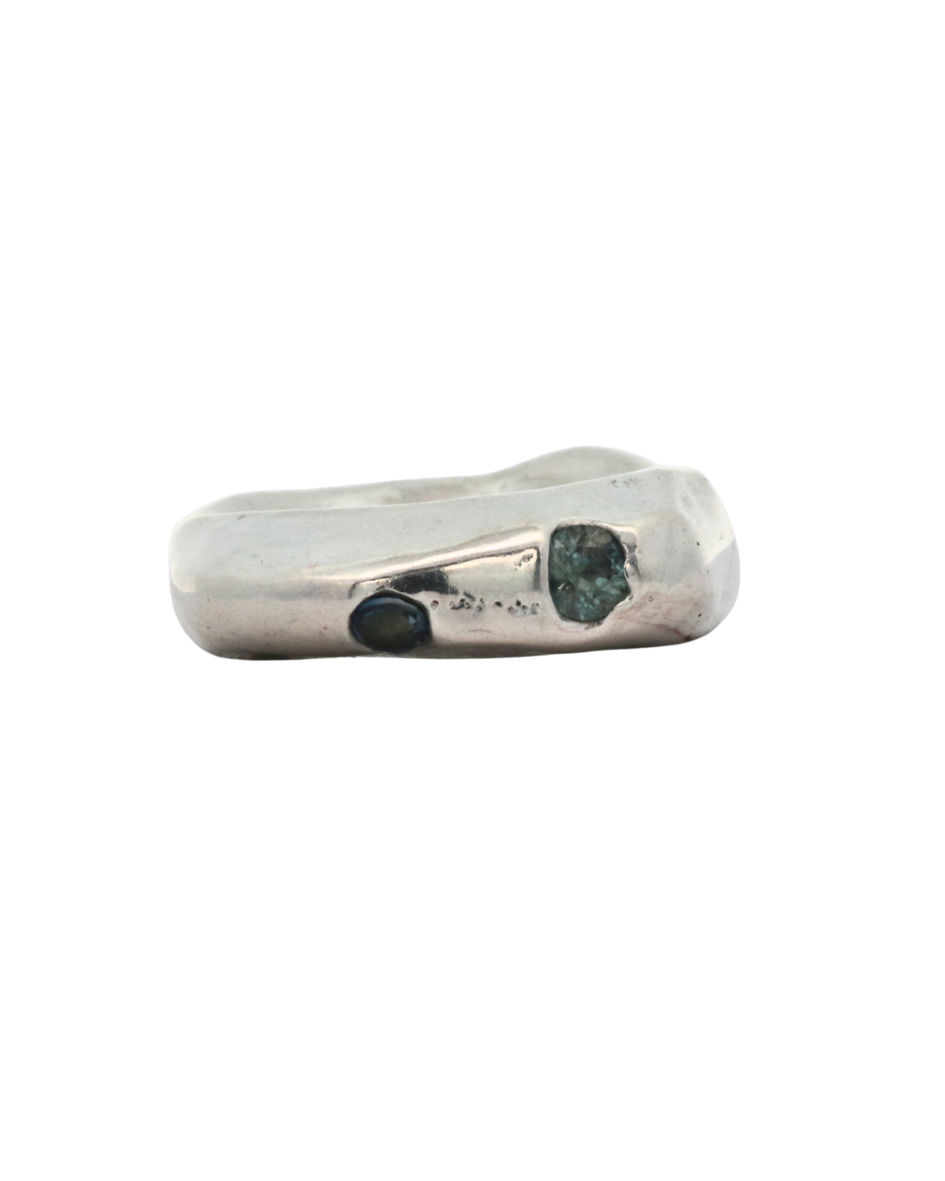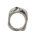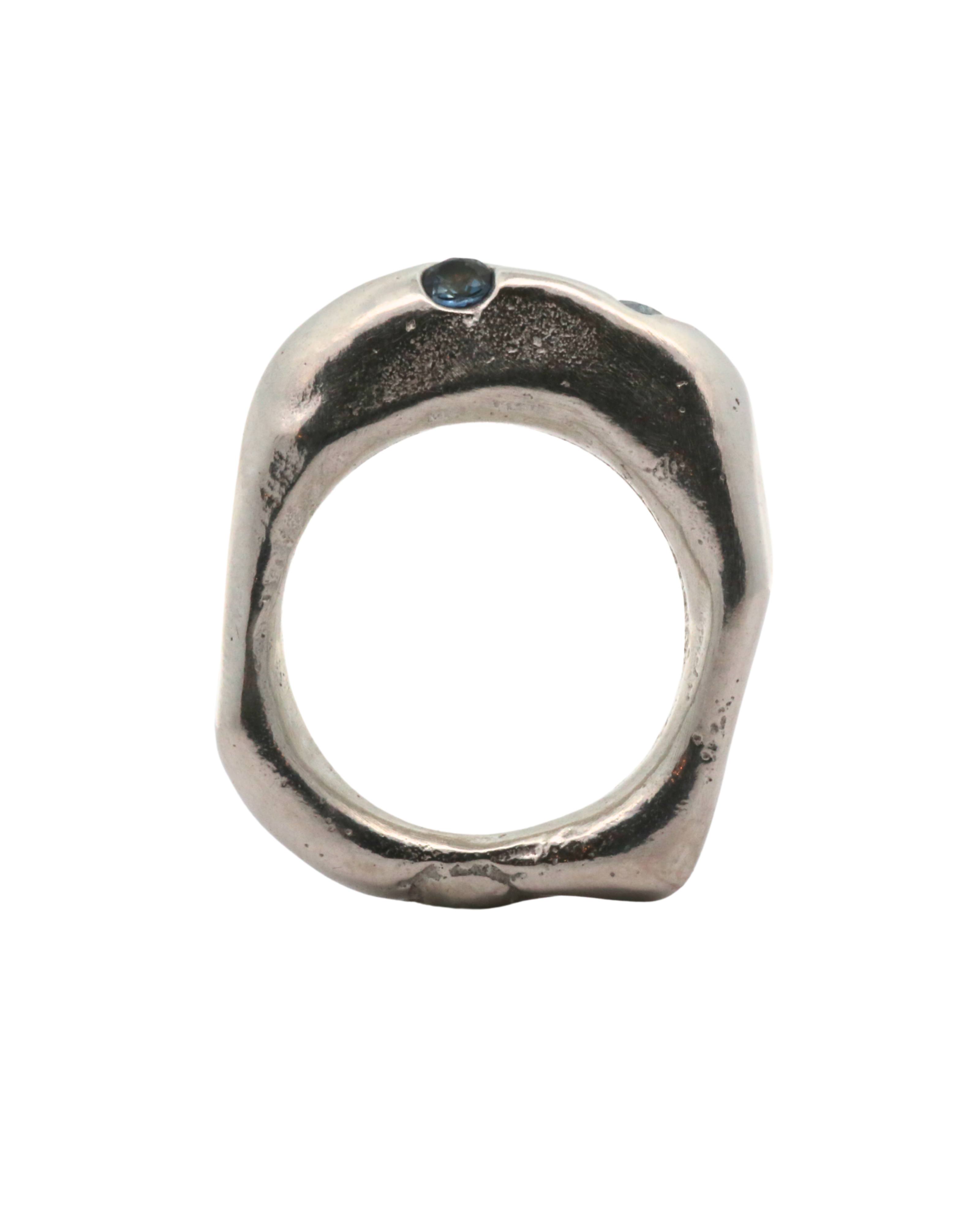 The Seebe is a weighty silver sculpture, This one has two embedded sapphires in shades of divine lavender blue.