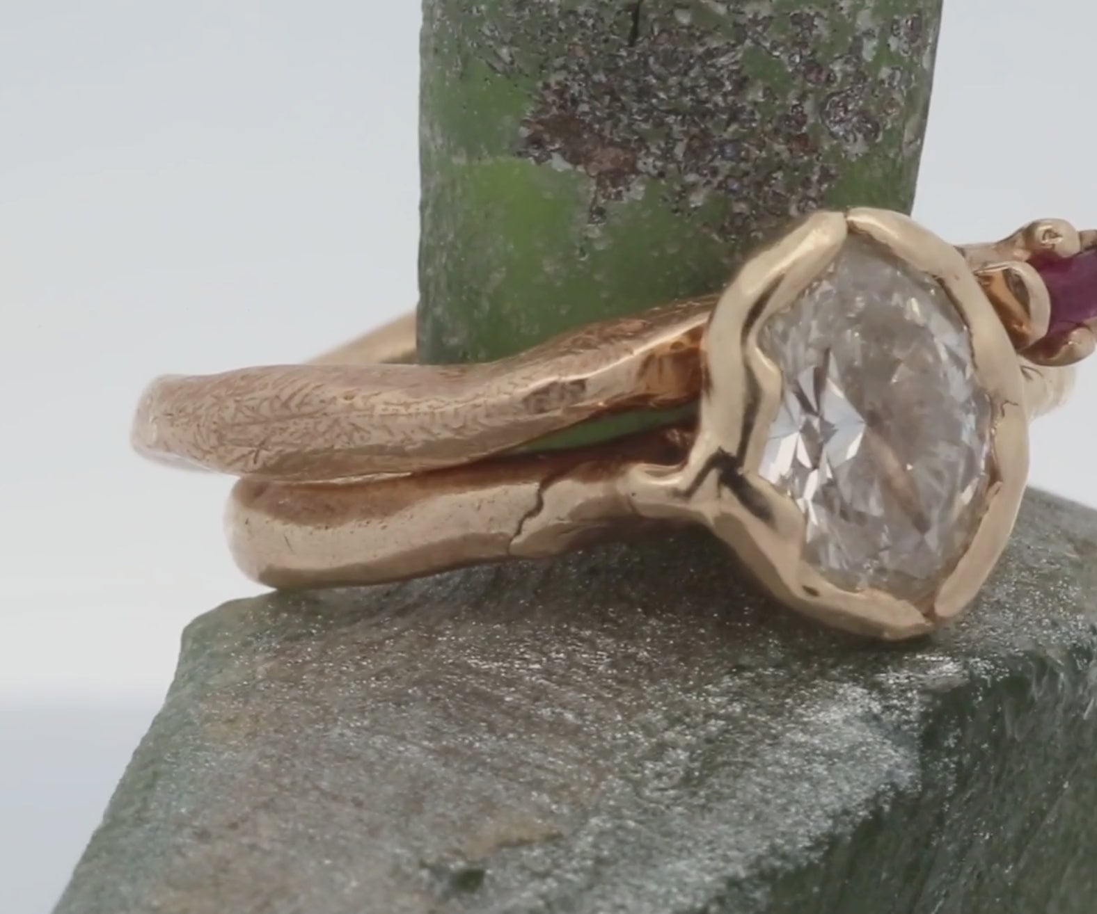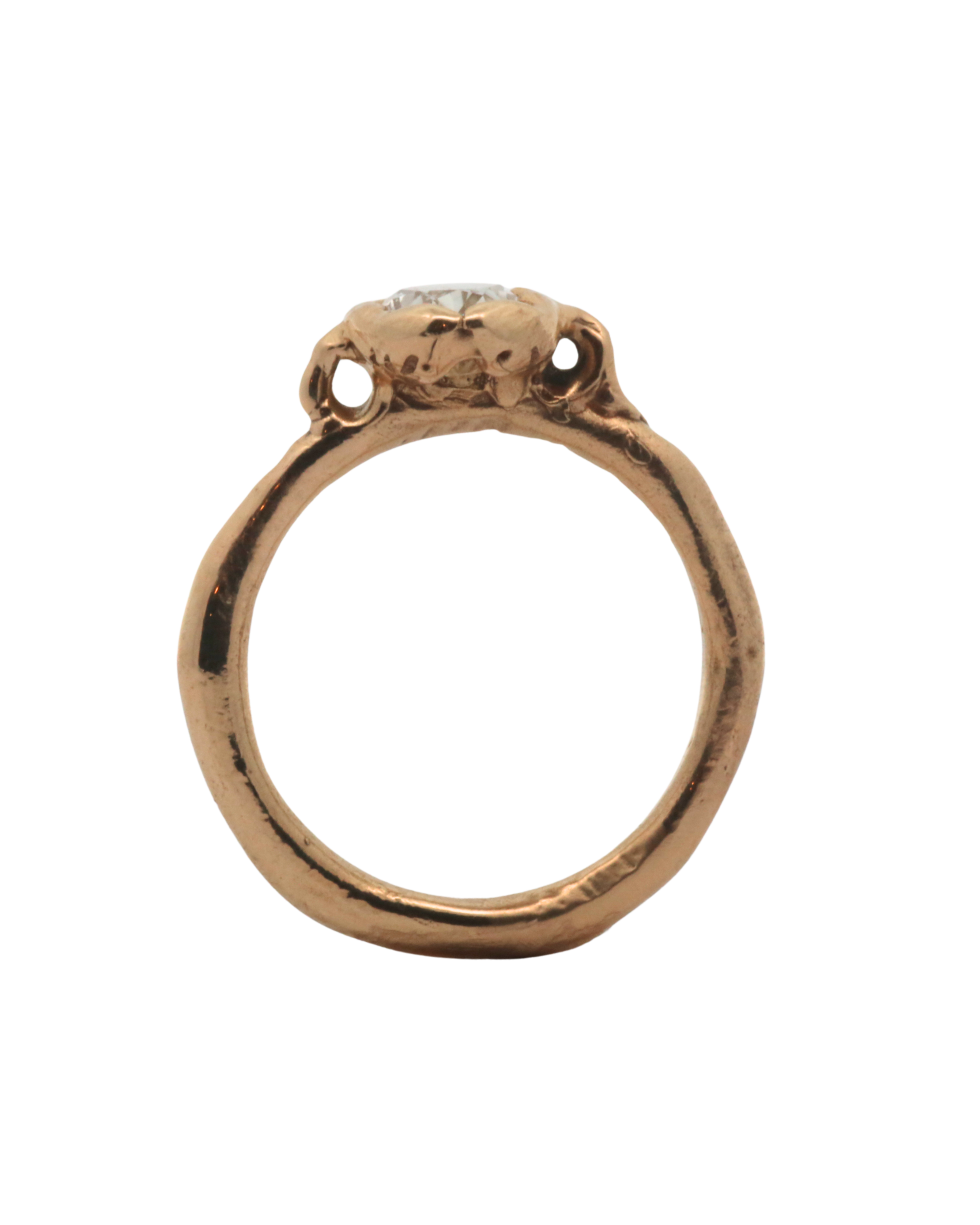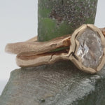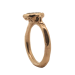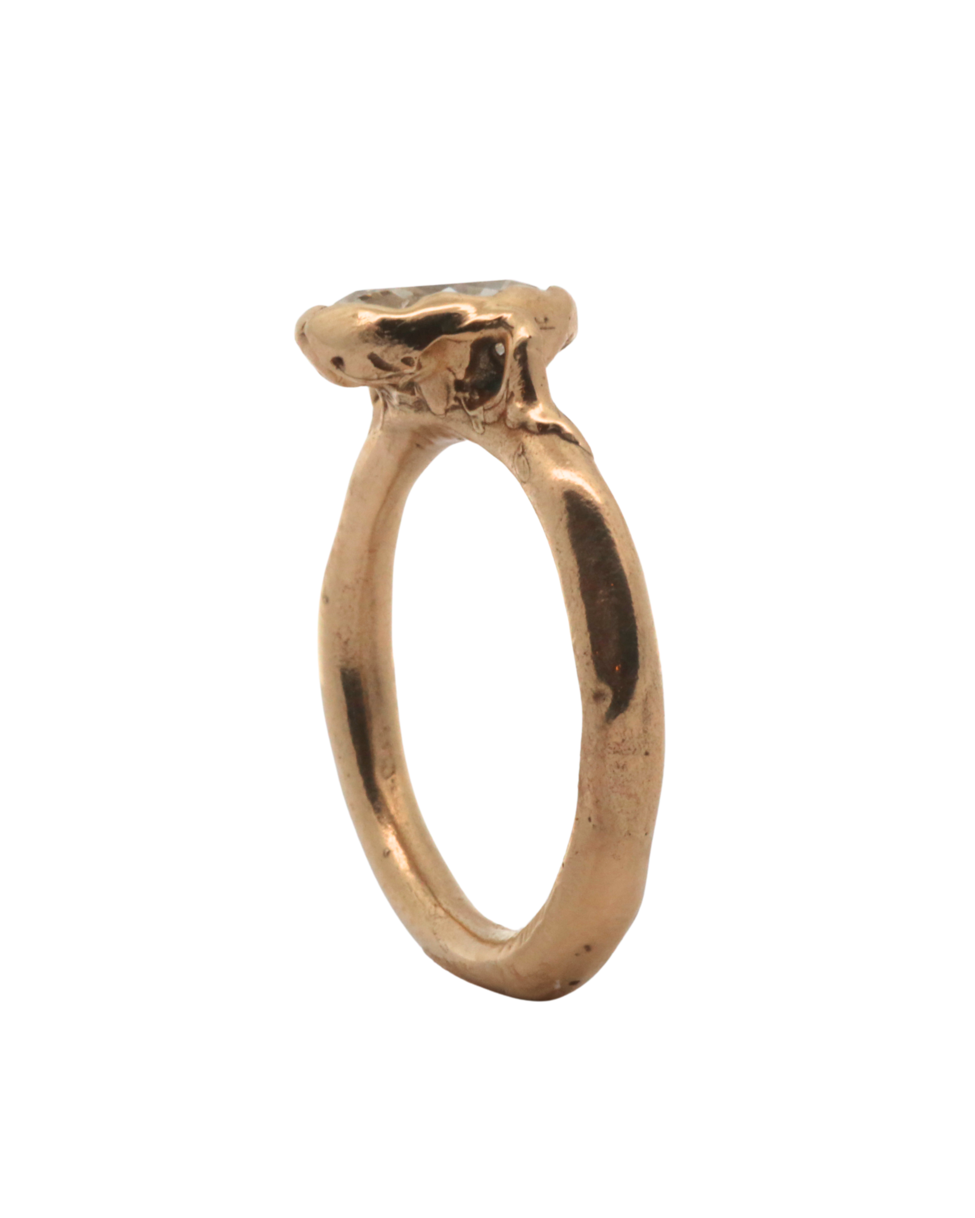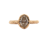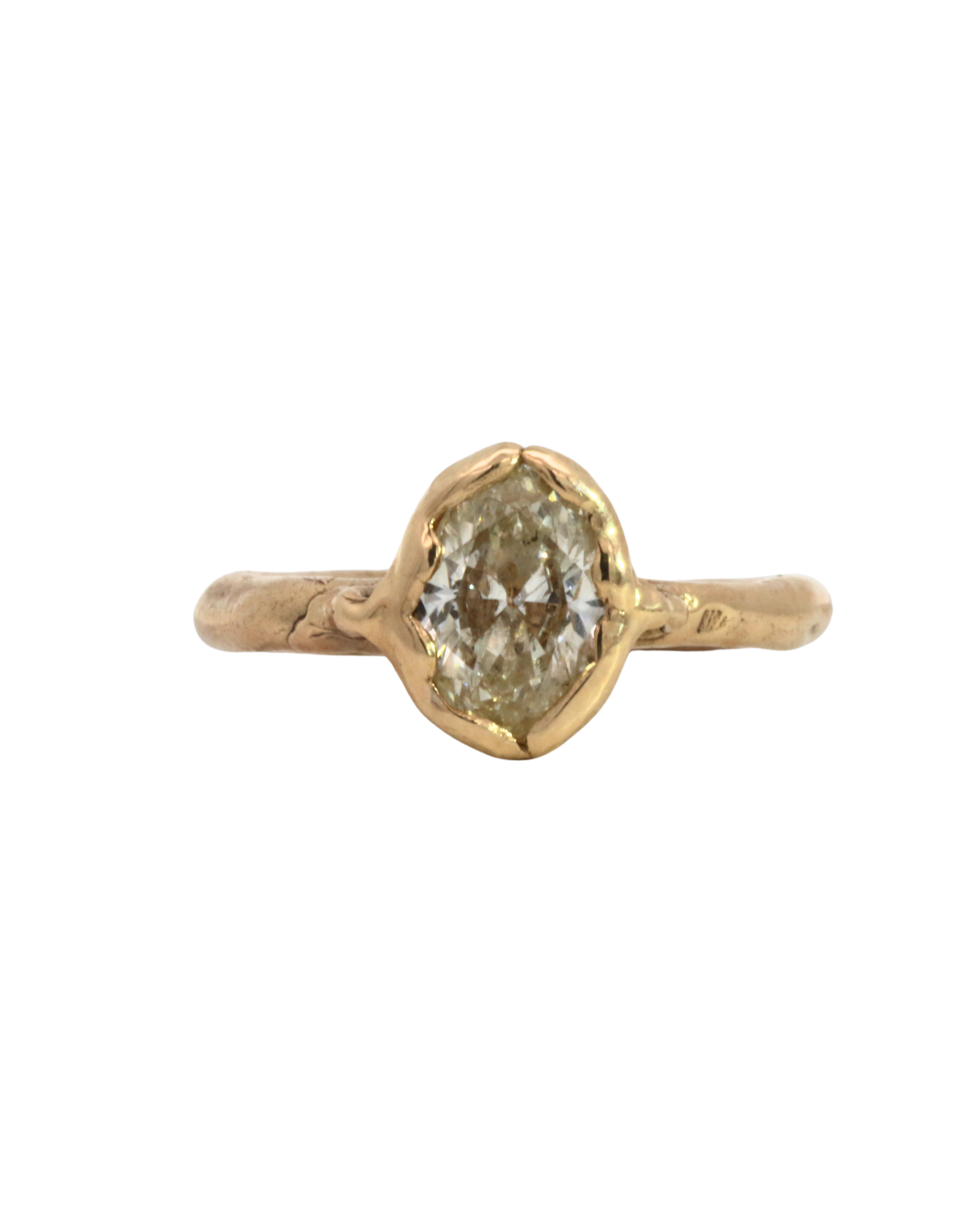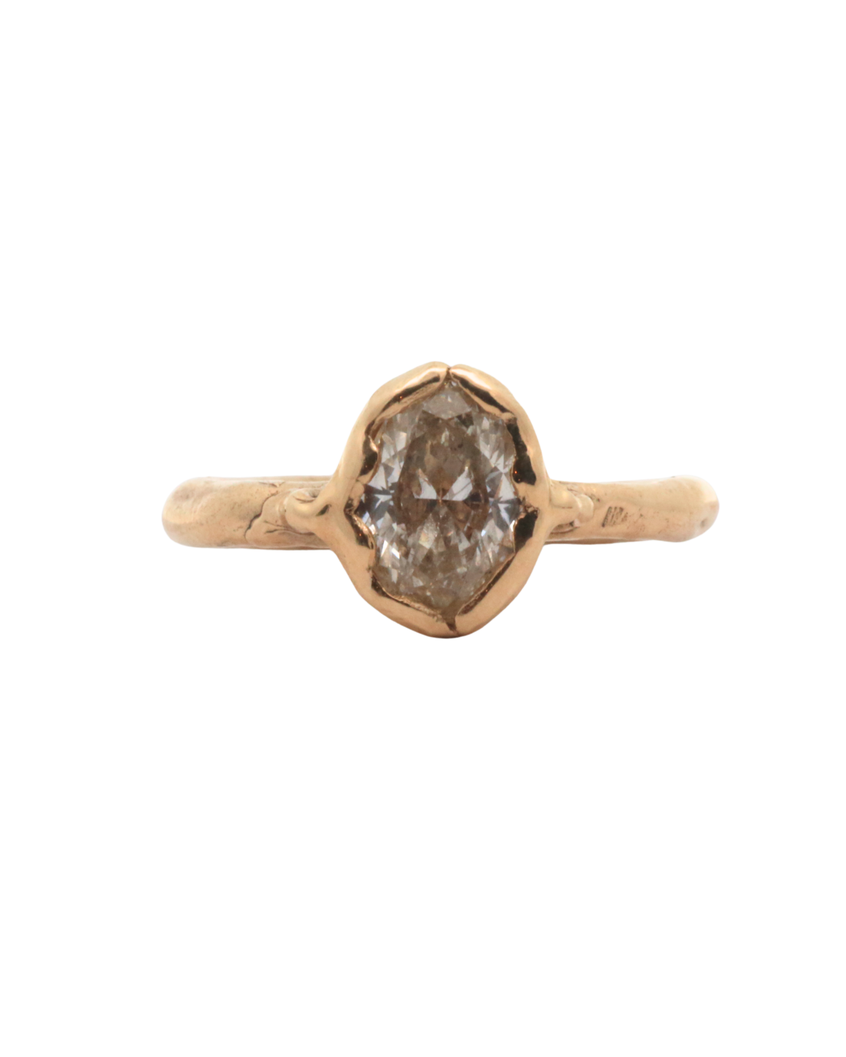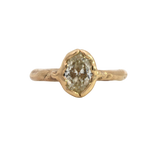 Hand carved engagement ring,  sculpted in wax and lost wax cast in 14K Fairmined gold with a 1ctw + natural champagne diamond.